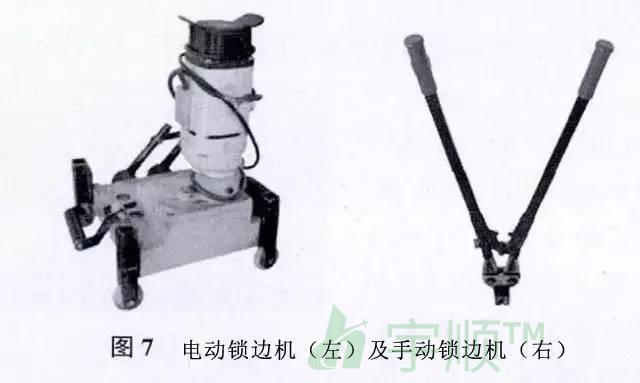 2)手動鎖邊機,在用電動鎖邊機之前先用手動鎖邊機鎖緊板端,以便于電動鎖邊機入位,見圖7(右)。