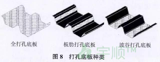 解決辦法:屋面底板穿孔+鋪設(shè)吸聲材料(無紡吸聲布及玻璃纖維棉),打孔底板種類見圖8。