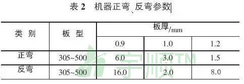 彎弧板機器正彎、反彎參數(shù),見表2。