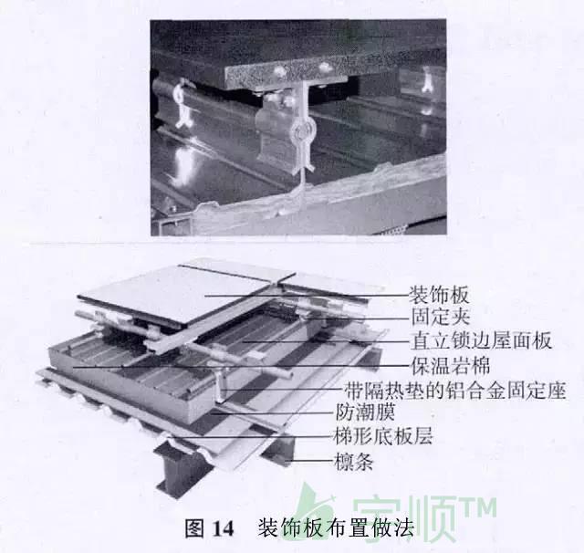 裝飾板系統(tǒng)的連接固定,無需在鋁鎂錳合金板上開洞;兩層板之間的開放式連接,無需維護,并可降低清理要求;可調(diào)節(jié)系統(tǒng)使裝飾板可完美布置,裝飾板布置做法見圖14。