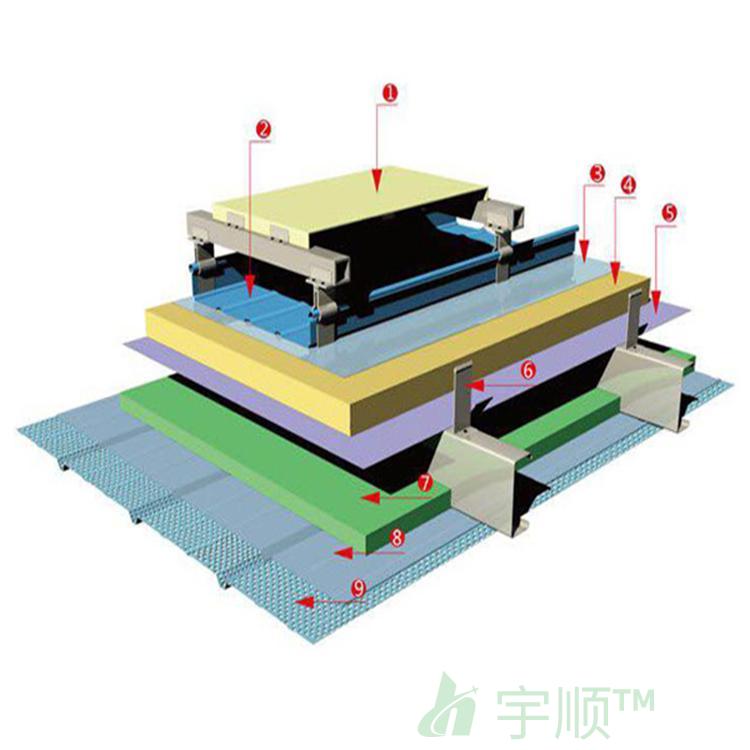 根據(jù)《建筑物防雷設(shè)計(jì)規(guī)范》第4.1.4條規(guī)定:當(dāng)金屬板下無(wú)易燃物品,板厚≥0.5mm時(shí),屋面板可作為接閃器。屋面施工時(shí)通過(guò)設(shè)置專用的避雷節(jié)點(diǎn),將金屬屋面板與下鋼結(jié)構(gòu)上下連通,形成回路,使屋面電流通過(guò)金屬物的上下傳遞,導(dǎo)入地面。屋面系統(tǒng)防雷處理,主要以屋面板及鋼連接件連通,作為防雷節(jié)點(diǎn),使電流能上下傳遞。屋面板為導(dǎo)電金屬物體,其下鋼檁條等與鋼結(jié)構(gòu)相連,可直接傳導(dǎo)電流。由于鋁合金與鋼二種材料的物理性能差異,為防止二者接觸引起電化學(xué)反應(yīng),在設(shè)計(jì)時(shí),我們?cè)诙哌B接處設(shè)置了絕緣物,主要表現(xiàn)為鋁合金支座下部的隔熱墊片。為了使之上下連通,我們?cè)谖菝嫔蠈⒉贾帽芾拙W(wǎng)線,通過(guò)鍍鋅鋼帶,將支座上的電流導(dǎo)入下部檁條,和鋼結(jié)構(gòu)連成一整體。避雷點(diǎn)的設(shè)置按照10×10米網(wǎng)格布置,在整個(gè)屋面形成網(wǎng)狀布設(shè)。